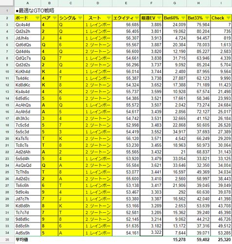 前回までのあらすじ: BTNvsBBの2bet potにおける32種類のペアボードにおいて、BTNからのCBについて、GTO戦略(Bet60%,Bet33%,Check)によるEV値を求めました。 このEV値と大きく乖離が無い簡単な戦略を探し、「疑似GTO戦略」として体系化してみます。 --- と…