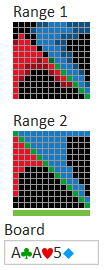 さて、フロップのボードが[AcAh5d]のとき、BTNのCB戦略は、どんなアクションを採ればいいのでしょう?
